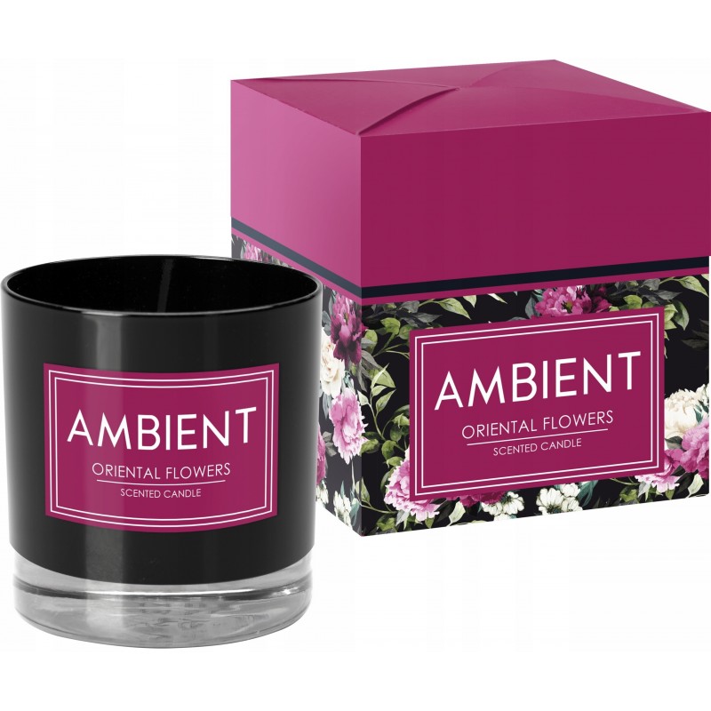 Świeca zapachowa z serii AMBIENT, o zapachu orientalnych kwiatów i czasie palenia do 32 godzin BISPOL.