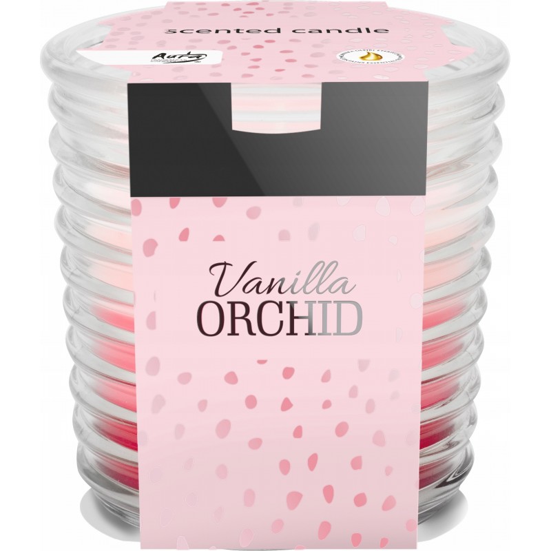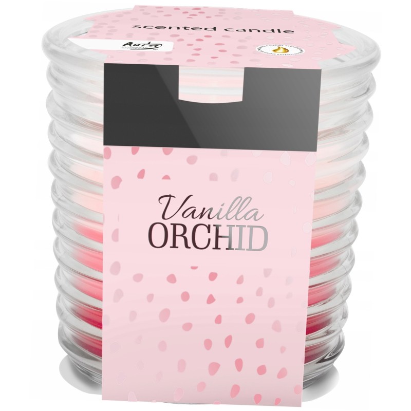 Świeca zapachowa w eleganckim, prążkowanym, transparentnym szkle o zapachu wanilii i orchidei oraz czasie palenia do 28 godzin BISPOL.