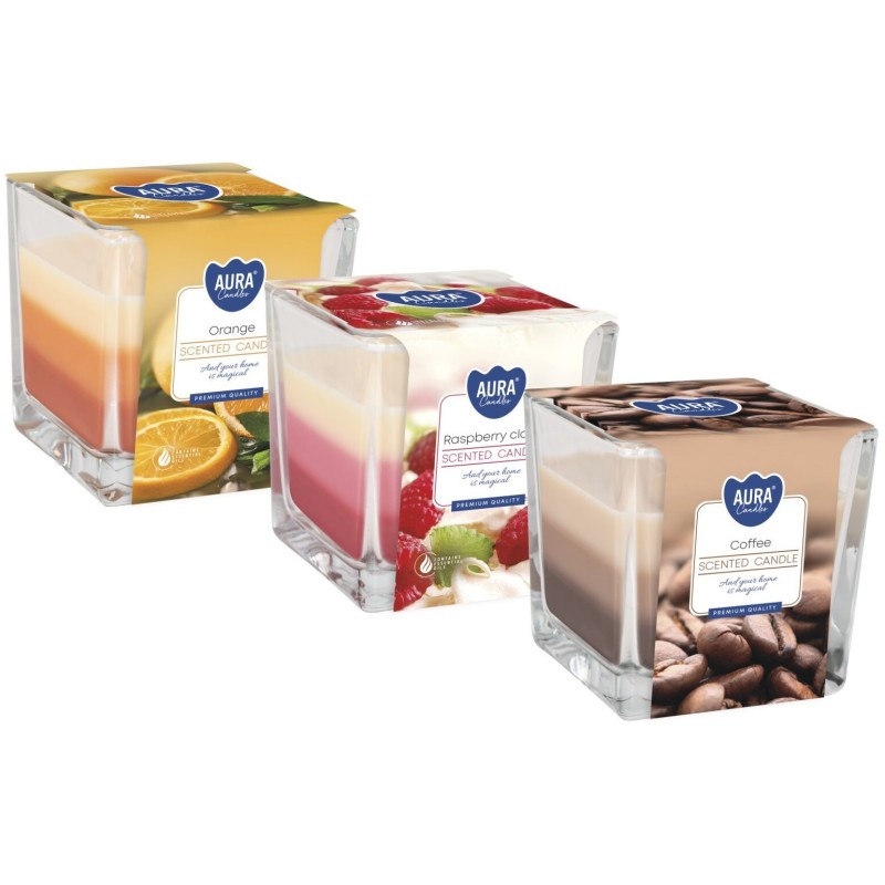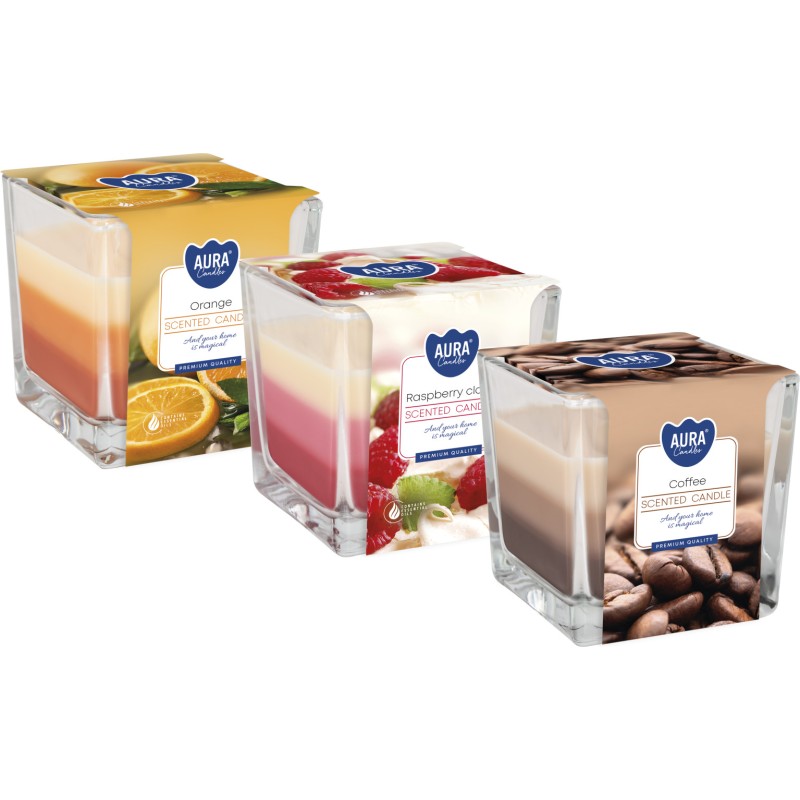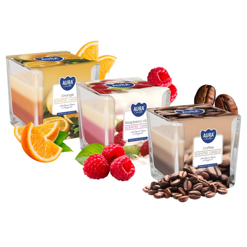 ZESTAW Trójwarstwowych świec zapachowych w szkle z dwoma knotami, w mixie zapachów (1x malinowej chmurki, 1x kawa, 1x pomarańcza) oraz czasie palenia do 32 godzin BISPOL.