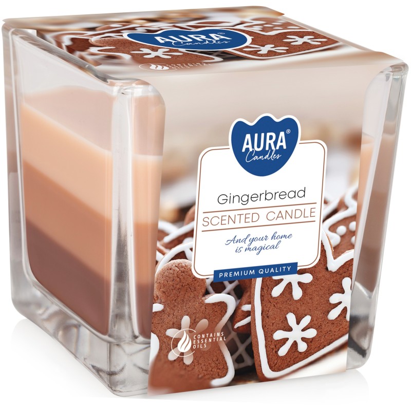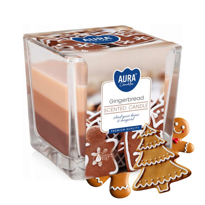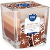 Trójwarstwowa świeca zapachowa w szkle z dwoma knotami, o zapachu pierniczków oraz czasie palenia do 32 godzin BISPOL.