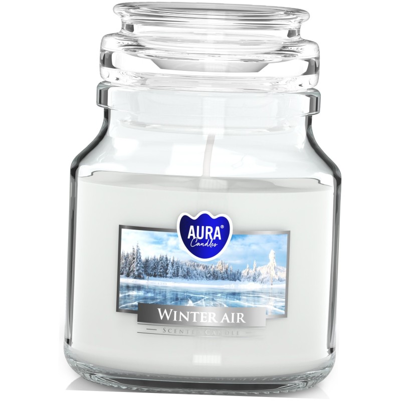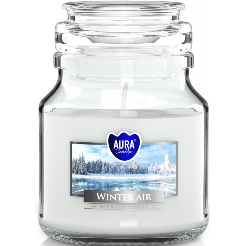 Mała świeca zapachowa w słoiku z wieczkiem, o zapachu zimowego powietrza i czasie palenia do 28 godzin BISPOL.