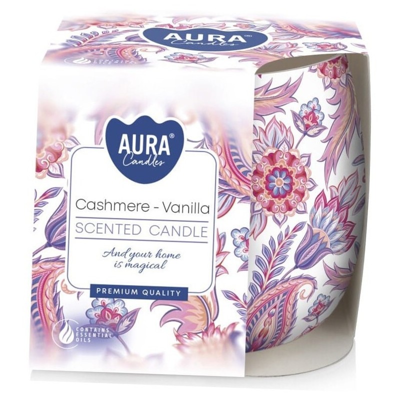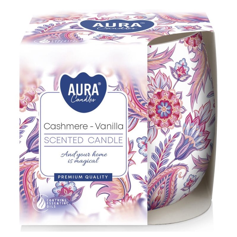 Świeca zapachowa w szkle, ozdobiona folią z motywem kaszmiru i wanilii oraz czasem palenia do 20 godzin BISPOL.