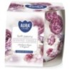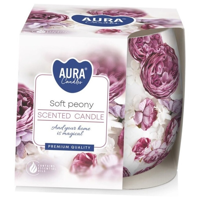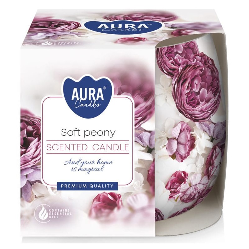Świeca zapachowa w szkle, ozdobiona folią z motywem delikatnej piwonii oraz czasem palenia do 20 godzin BISPOL.
