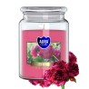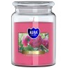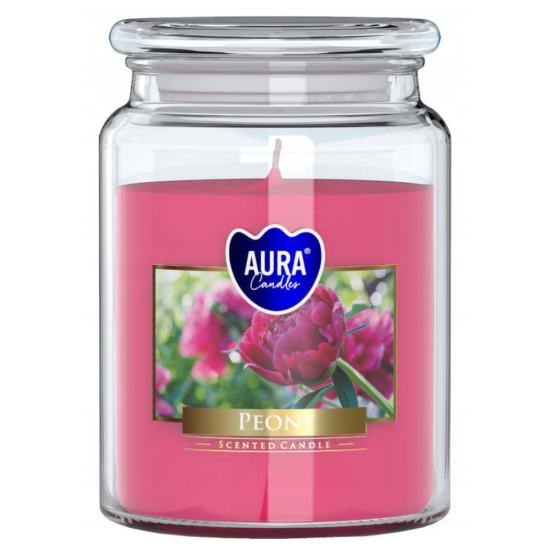Duża świeca zapachowa w słoiku z wieczkiem, o zapachu piwonii i czasie palenia do 100 godzin BISPOL.