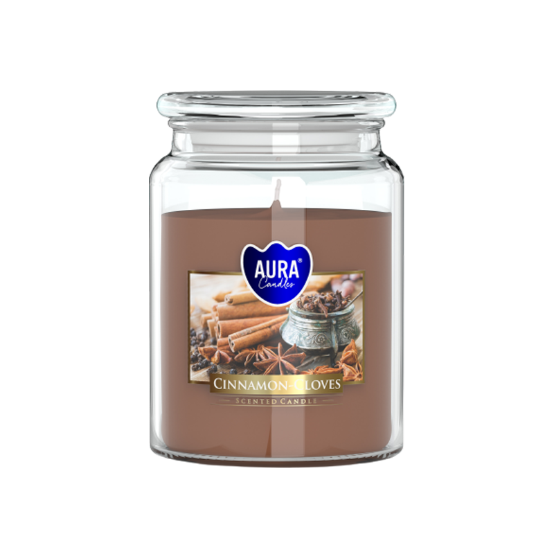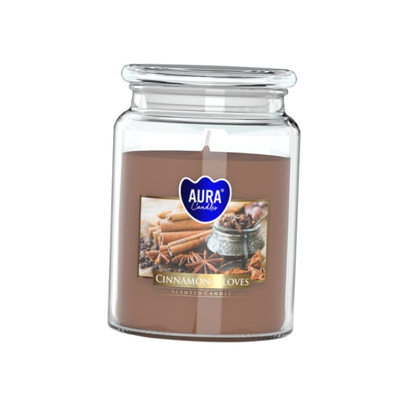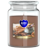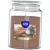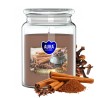 Duża świeca zapachowa w słoiku z wieczkiem, o zapachu cynamonu i goździków i czasie palenia do 100 godzin BISPOL.