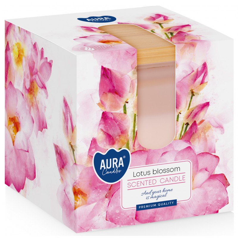 Świeca zapachowa w matowym szkle, drewnianym wieczkiem z dwoma knotami, o zapachu kwiatu lotosu oraz czasie palenia do 26 godzin BISPOL.