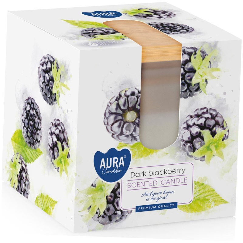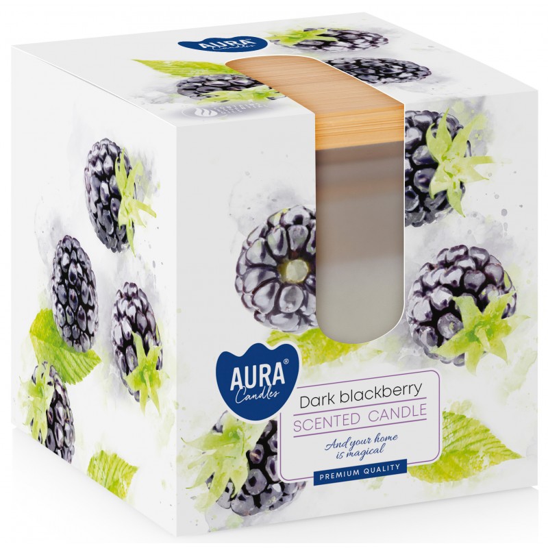 Świeca zapachowa w matowym szkle, drewnianym wieczkiem z dwoma knotami, o zapachu ciemnej jeżyny oraz czasie palenia do 26 godzin BISPOL.