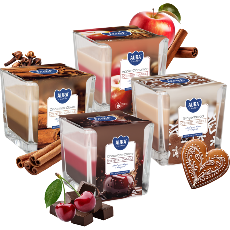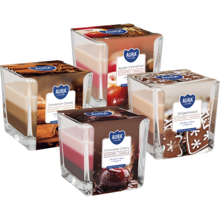 ZESTAW Trójwarstwowych świec zapachowych w szkle z dwoma knotami, w mixie zapachów oraz czasie palenia do 32 godzin BISPOL.