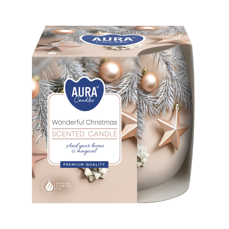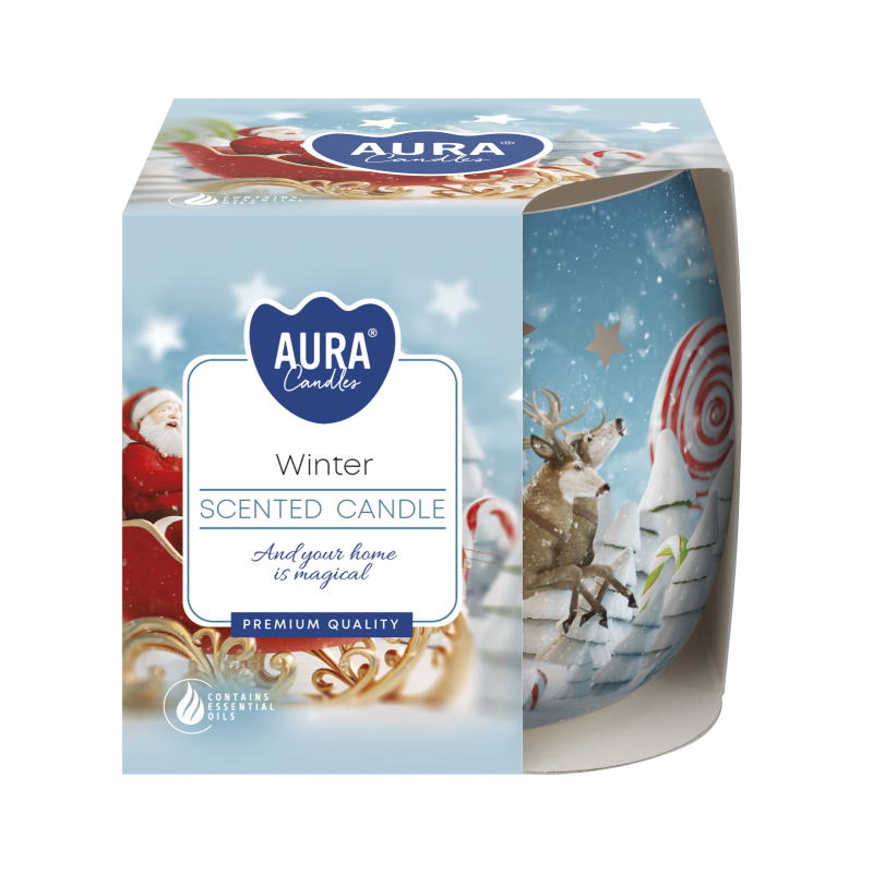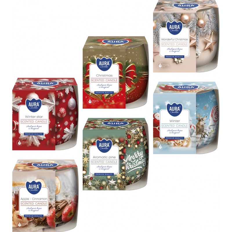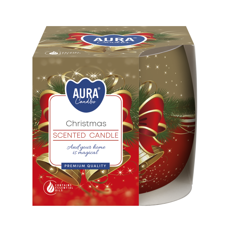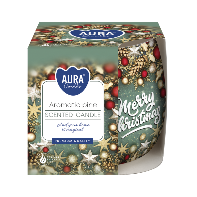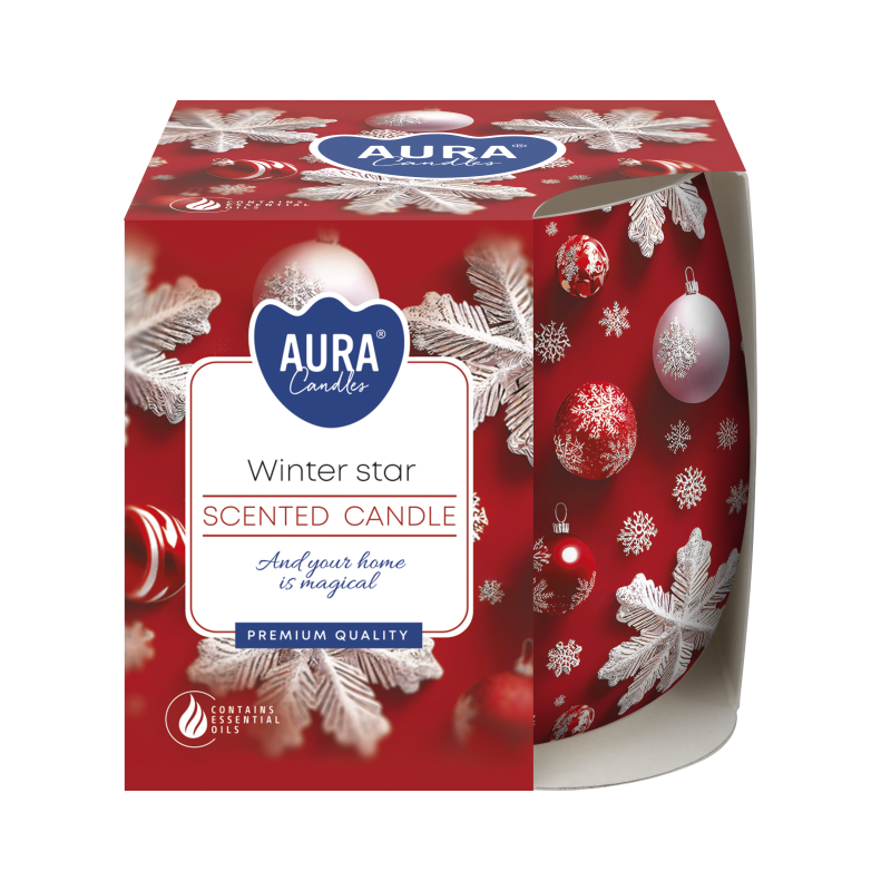 Świeca zapachowa w szkle, ozdobiona folią z motywem gwiazdki oraz czasem palenia do 20 godzin BISPOL.