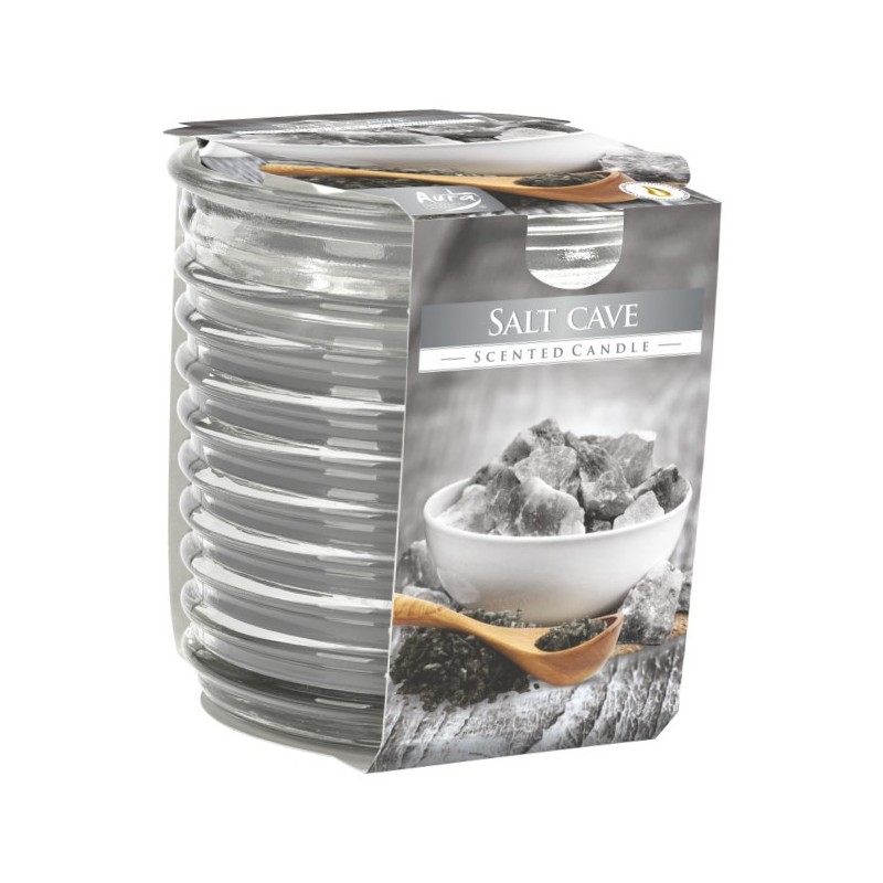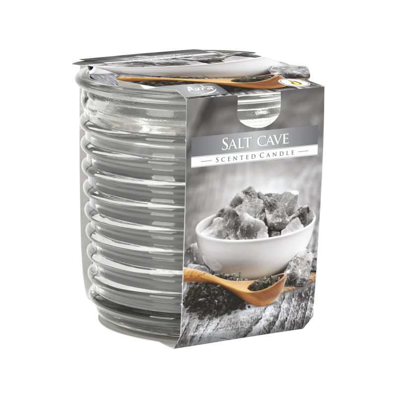 Świeca zapachowa w eleganckim, prążkowanym, transparentnym szkle o zapachu groty solnej oraz czasie palenia do 28 godzin BISPOL.