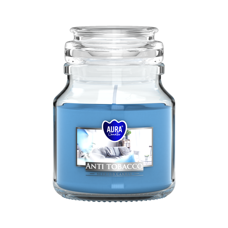 Mała świeca zapachowa w słoiku z wieczkiem, o zapachu antytabaku i czasie palenia do 28 godzin BISPOL.