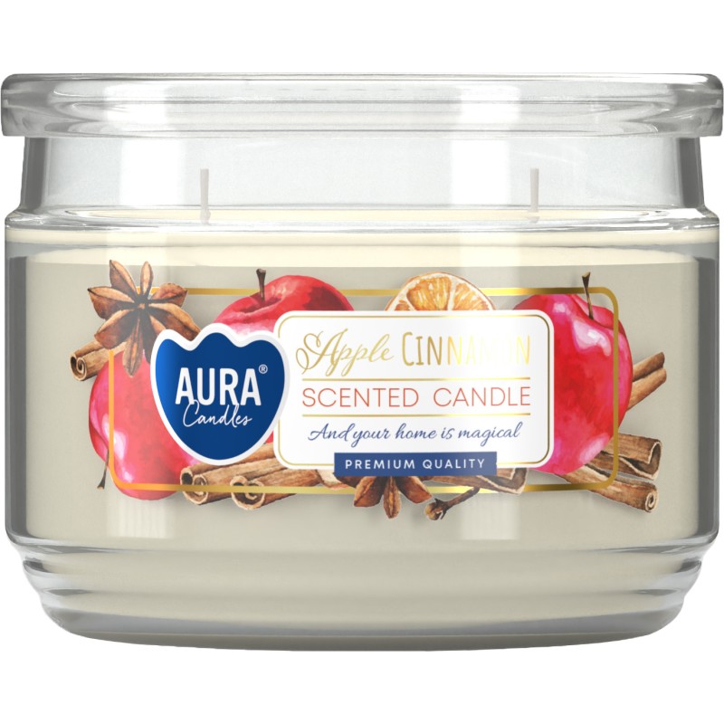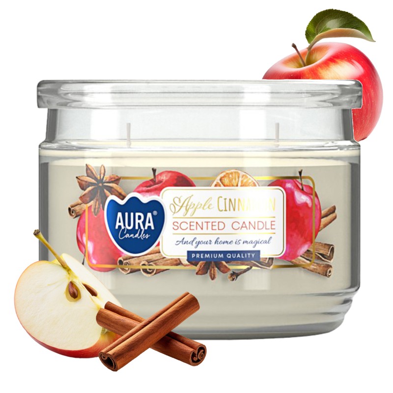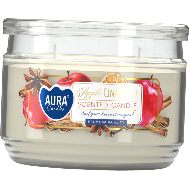Świeca zapachowa w szkle jabłko - cynamon z plastikową pokrywką, dwoma knotami o czasie palenia do 30 godzin BISPOL.