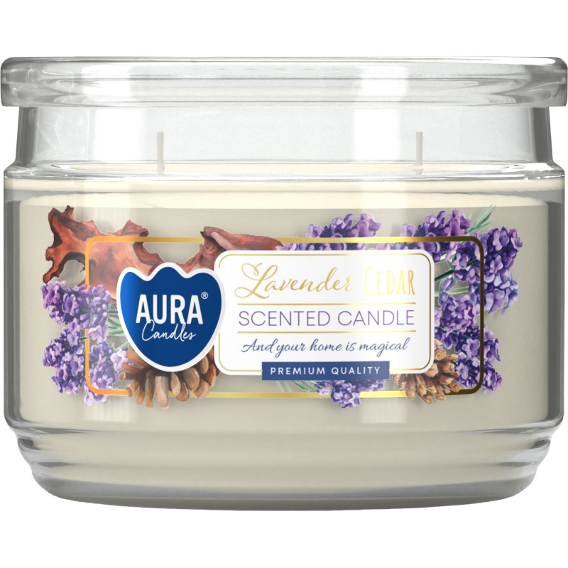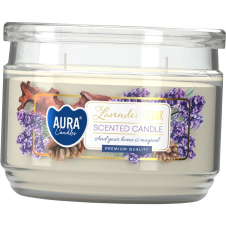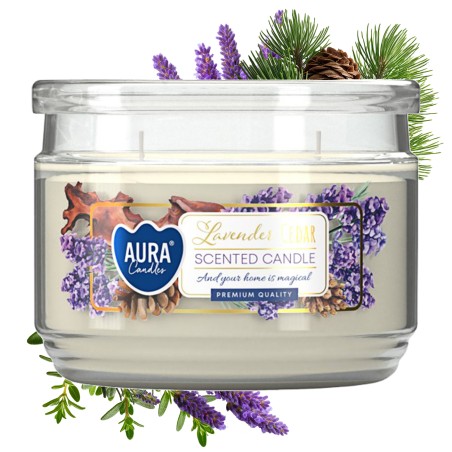 Świeca zapachowa w szkle lawenda - cedr z plastikową pokrywką, dwoma knotami o czasie palenia do 30 godzin BISPOL.