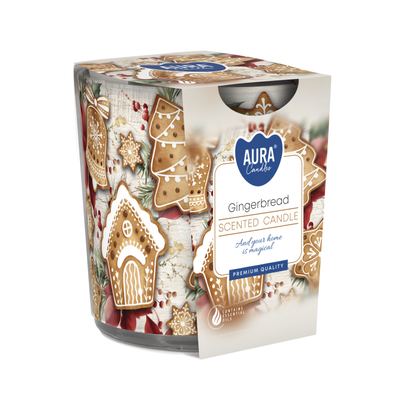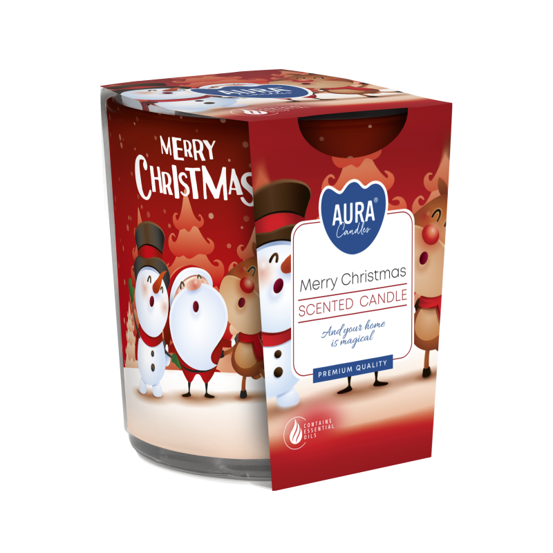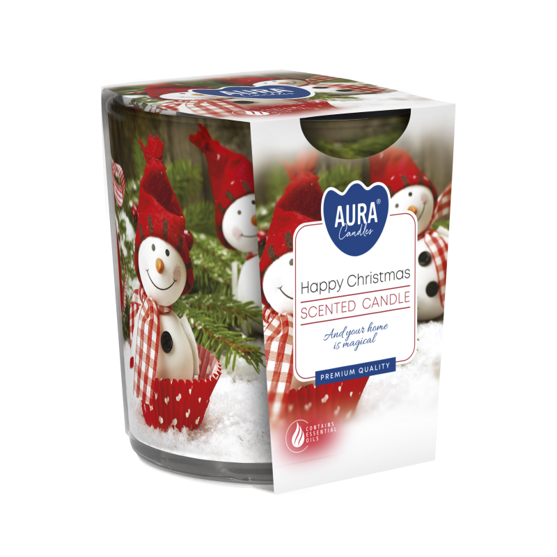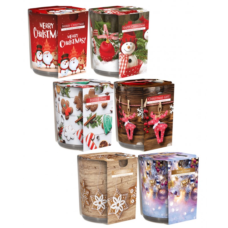 Świeca zapachowa w szkle, ozdobiona folią z motywem świątecznym oraz czasem palenia do 22 godzin BISPOL.