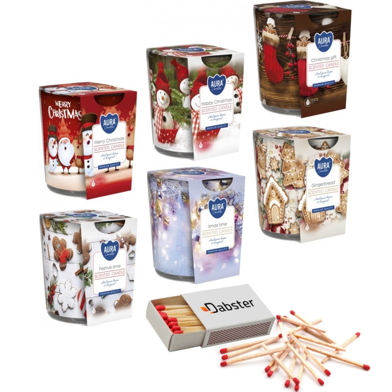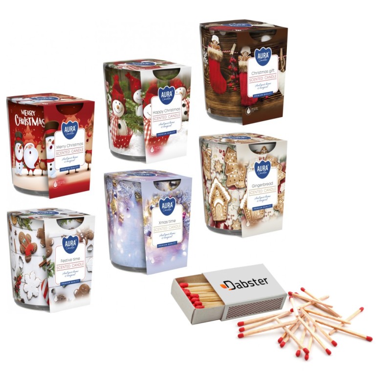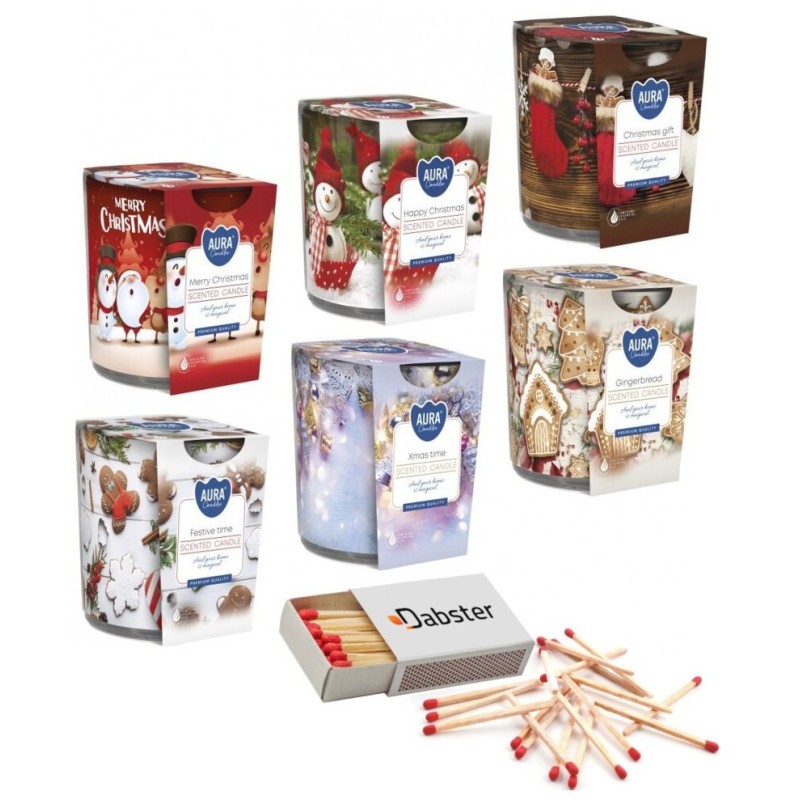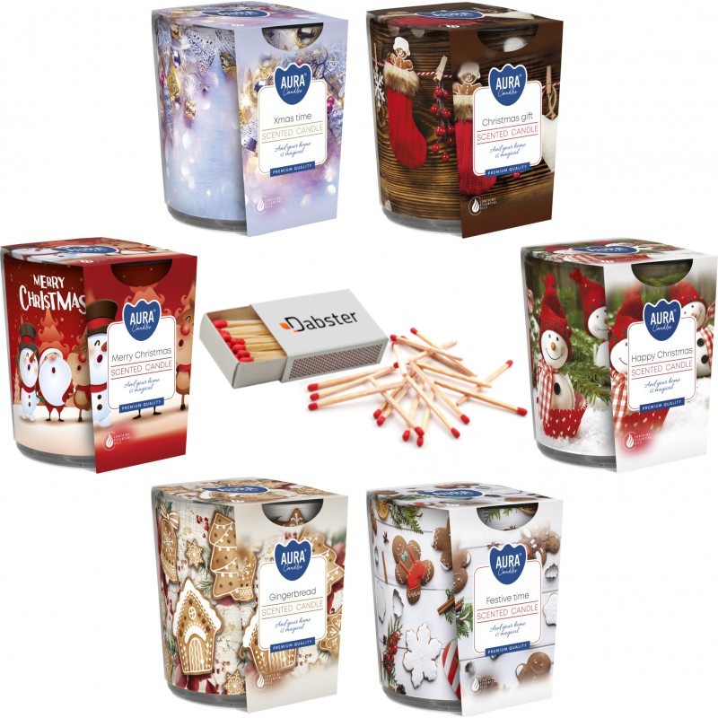 Świeca zapachowa w szkle BISPOL Aura 22H 6 szt. ŚWIĄTECZNY MIX + Zapałki DABSTER_PL 38szt.