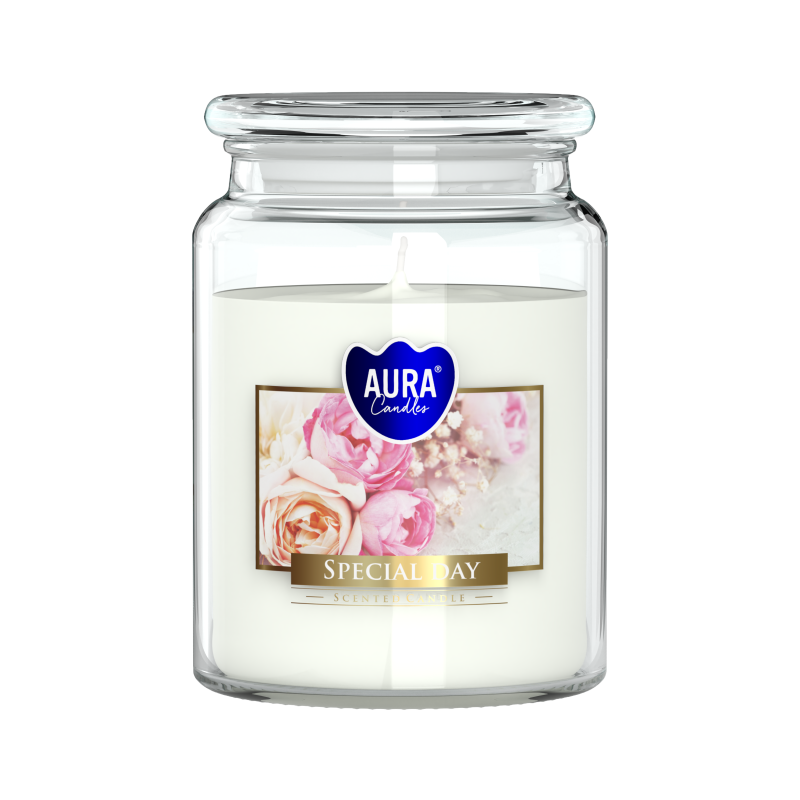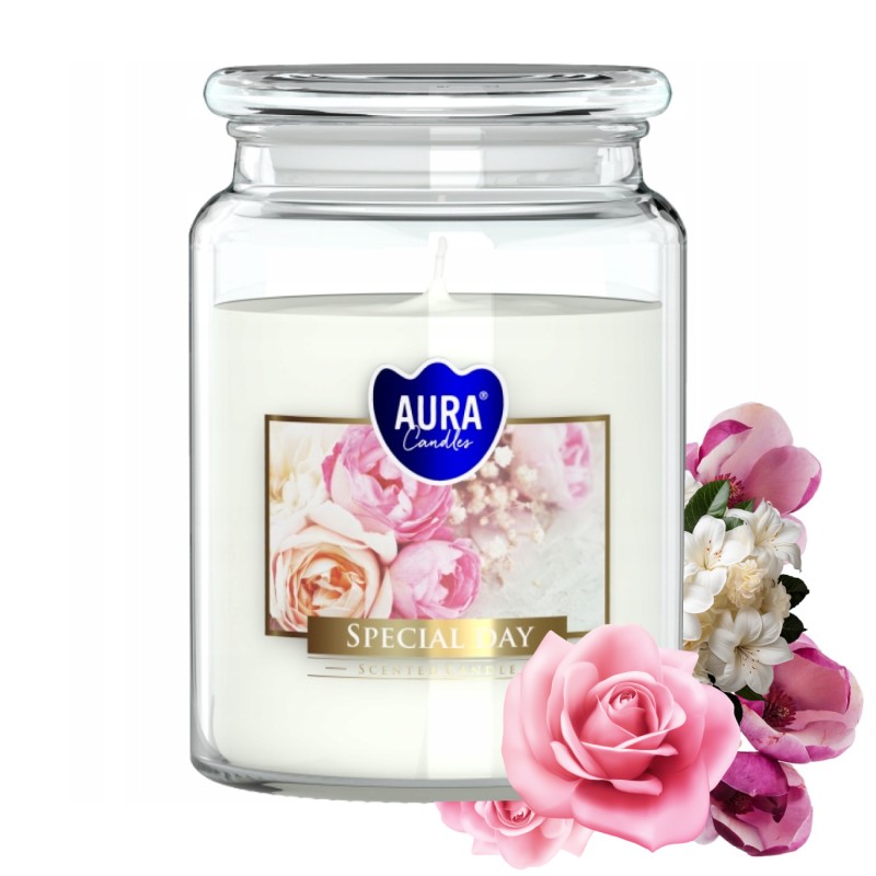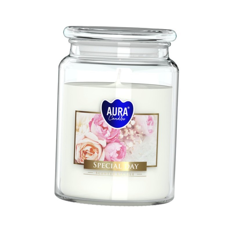 Duża świeca zapachowa w słoiku z wieczkiem, o zapachu wyjątkowego dnia i czasie palenia do 100 godzin BISPOL.