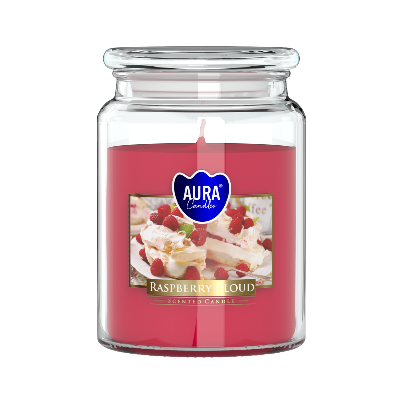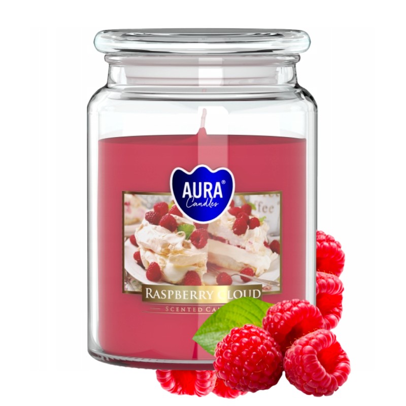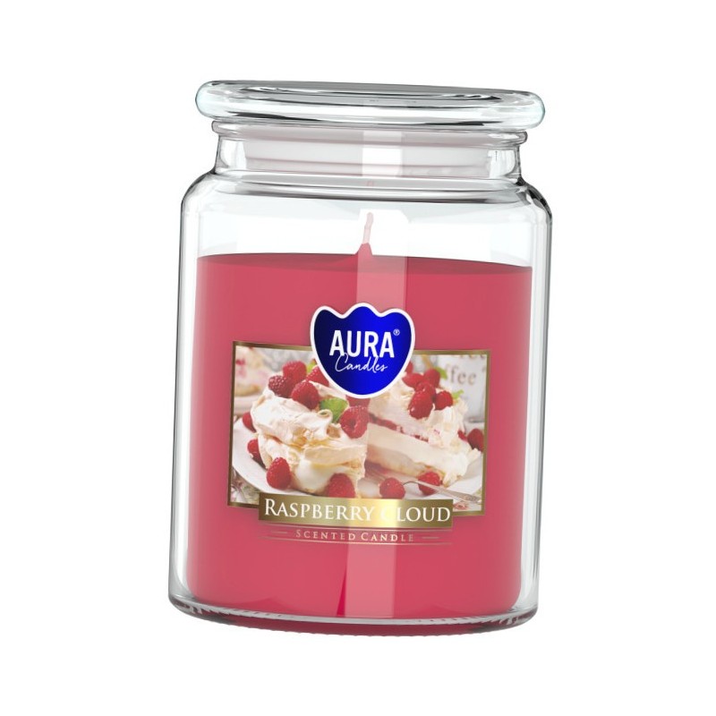 Duża świeca zapachowa w słoiku z wieczkiem, o zapachu malinowej chmurki i czasie palenia do 100 godzin BISPOL.
