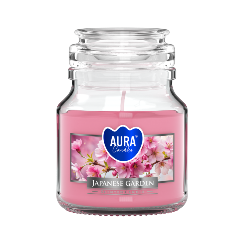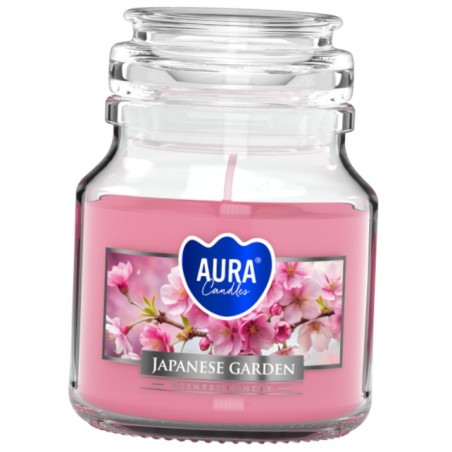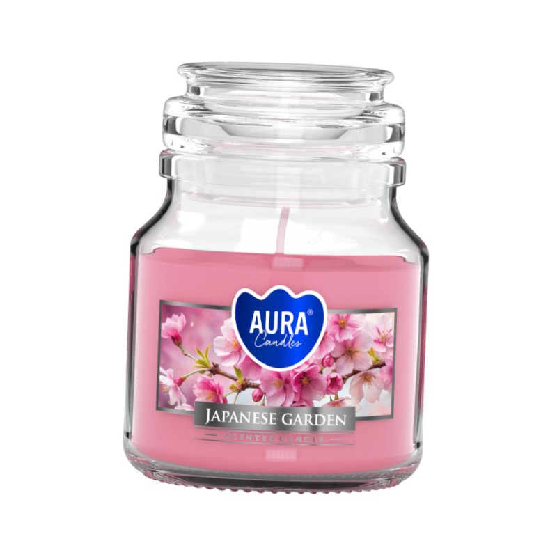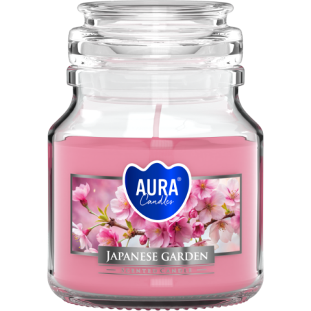 Mała świeca zapachowa w słoiku z wieczkiem, o zapachu japońskiego ogrodu i czasie palenia do 28 godzin BISPOL.