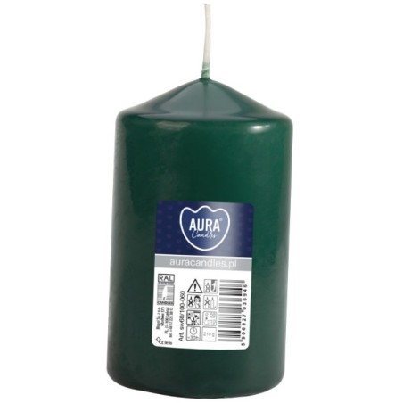 Świeca dekoracyjna w kolorze butelkowej zielenikształcie walca, bezzapachowa o wysokości 10cm, średnicy 5,8cm i czasie palenia do 30 godzin BISPOL.