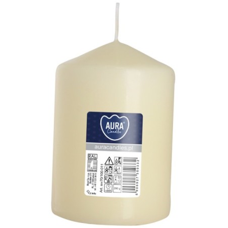 Kremowa świeca dekoracyjna w kształcie walca, bezzapachowa o wysokości 10cm, średnicy 6,8cm i czasie palenia do 44 godzin BISPOL.