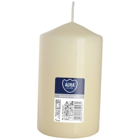 Kremowa świeca dekoracyjna w kształcie walca, bezzapachowa o wysokości 12cm, średnicy 6,8cm i czasie palenia do 50 godzin BISPOL.