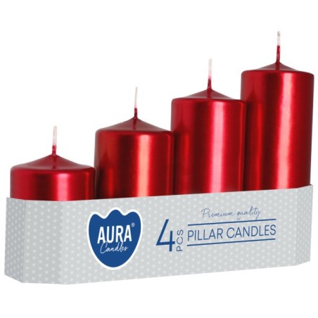 Zestaw świec stopniowanych w kształcie walca, w kolorze czerwony metalik, bezzapachowe, o wysokościach 7cm, 9cm,11cm,13cm, średnicy 4,8cm i czasie palenia od 11 do 33 godzin BISPOL. Pakowane po 4 szt. jednostkowe w opakowaniu zbiorczym.