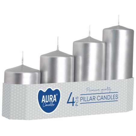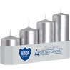 Zestaw świec stopniowanych w kształcie walca, w kolorze srebrny metalik, bezzapachowe, o wysokościach 7cm, 9cm,11cm,13cm, średnicy 4,8cm i czasie palenia od 11 do 33 godzin BISPOL. Pakowane po 4 szt. jednostkowe w opakowaniu zbiorczym.