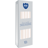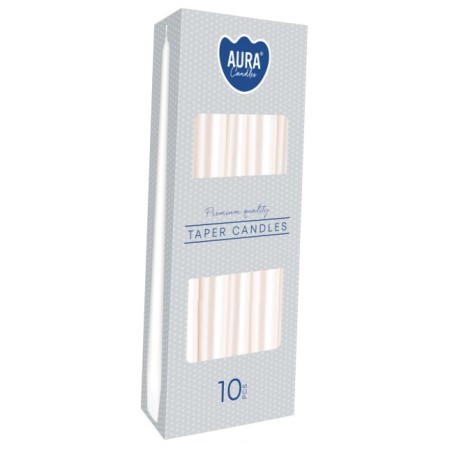 Dekoracyjna świeca stołowa w kształcie stożka, w kolorze biała perła, niekapiąca, bezzapachowa o wysokości 24,5cm, średnicy 2,3cm i czasie palenia do 7 godzin BISPOL. Pakowana po 10 szt. jednostkowych w opakowaniu zbiorczym.
