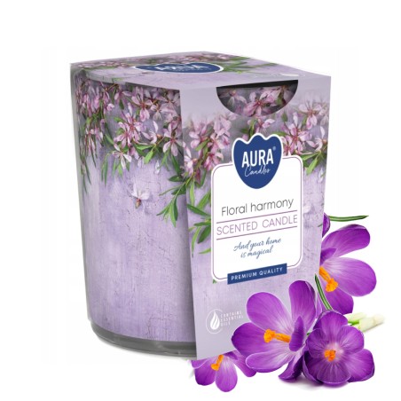 Świeca zapachowa w szkle, ozdobiona folią z motywem kwiatowej harmonii oraz czasem palenia do 22 godzin BISPOL.
