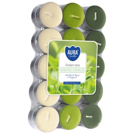 Tealighty Podgrzewacze o zapachu zielonej herbaty, różnobarwnym wosku i czasie palenia do 4 godzin BISPOL. Pakowane po 30 szt jednostkowych w opakowaniu zbiorczym.