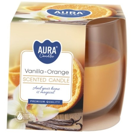 Świeca zapachowa w szkle o zapachu wanili i pomarańczy oraz czasie palenia do 24 godzin BISPOL.