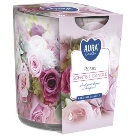Świeca zapachowa w szkle, ozdobiona folią z motywem róż oraz czasem palenia do 22 godzin BISPOL.