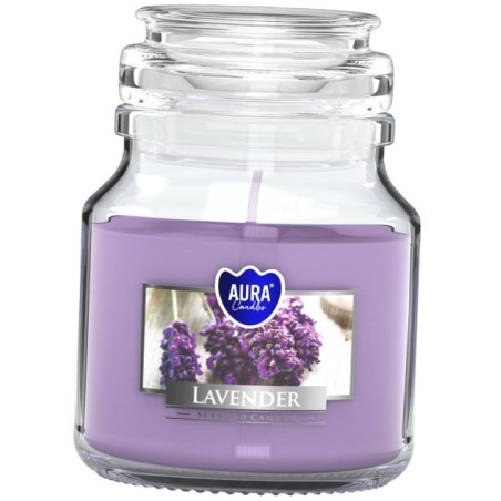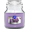 Mała świeca zapachowa w słoiku z wieczkiem, o zapachu lawendy i czasie palenia do 28 godzin BISPOL.