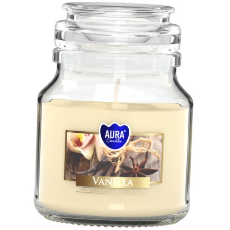 Mała świeca zapachowa w słoiku z wieczkiem, o zapachu wanilii i czasie palenia do 28 godzin BISPOL.