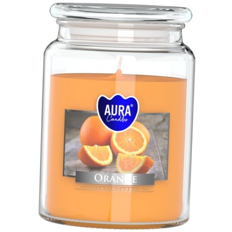 Duża świeca zapachowa w słoiku z wieczkiem, o zapachu pomarańczy i czasie palenia do 100 godzin BISPOL.