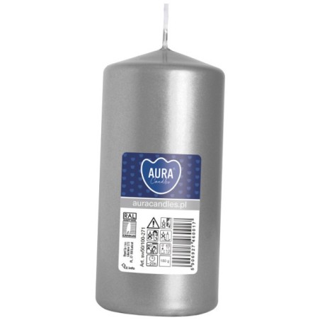 Świeca dekoracyjna w kształcie walca, w kolorze srebrny metalik, bezzapachowa o wysokości 10cm, średnicy 4,8cm i czasie palenia do 20 godzin BISPOL.