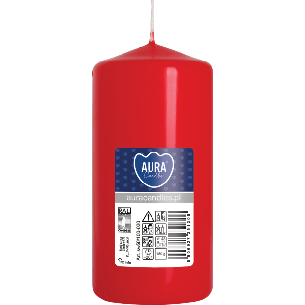 Czerwona świeca dekoracyjna w kształcie walca, bezzapachowa o wysokości 10cm, średnicy 4,8cm i czasie palenia do 20 godzin BISPOL.