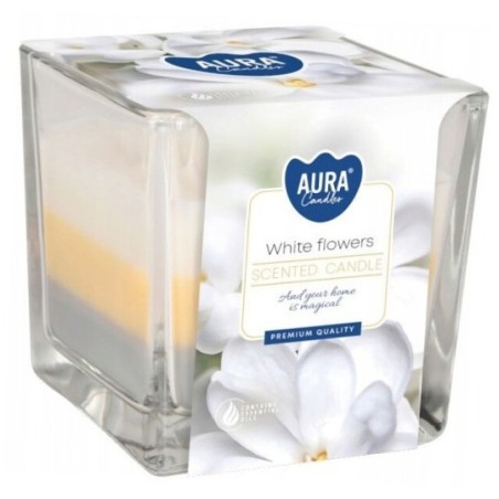 Trójwarstwowa świeca zapachowa w szkle z dwoma knotami, o zapachu białych kwiatów oraz czasie palenia do 32 godzin BISPOL.