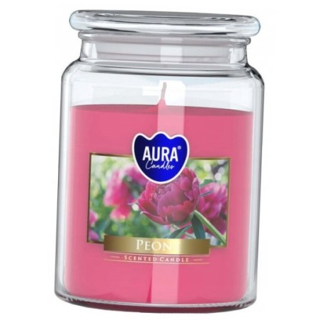 Duża świeca zapachowa w słoiku z wieczkiem, o zapachu piwonii i czasie palenia do 100 godzin BISPOL.