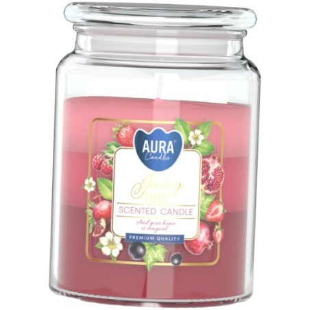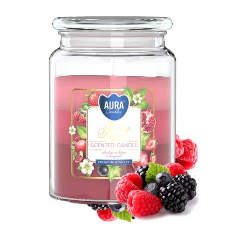 Duża, trójwarstwowa świeca zapachowa w słoiku z wieczkiem, o zapachu soczystych owoców i czasie palenia do 100 godzin BISPOL.