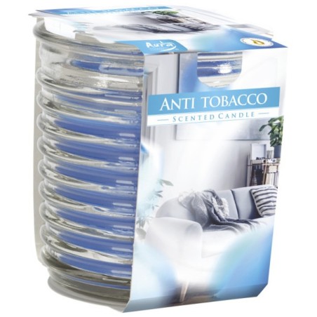 Świeca zapachowa w eleganckim, prążkowanym, transparentnym szkle o zapachu antytabaku oraz czasie palenia do 28 godzin BISPOL.