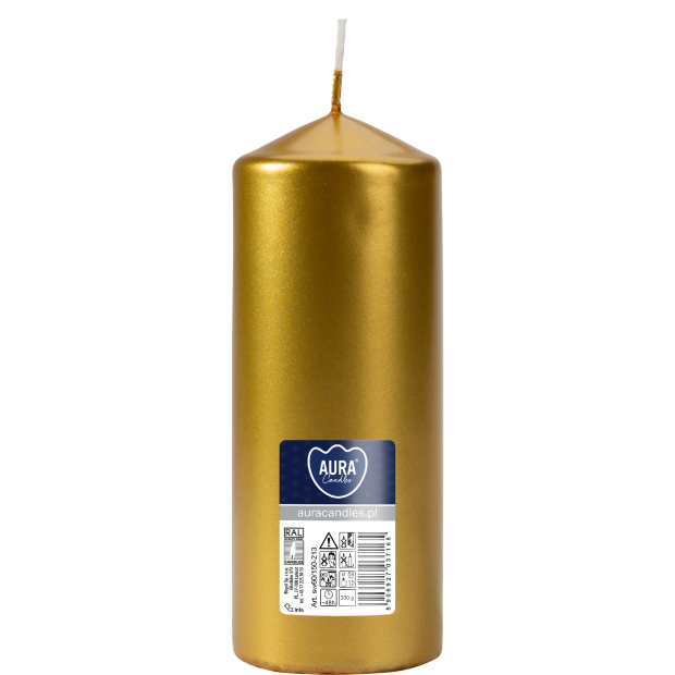 Świeca dekoracyjna w kolorze złoty metalik, kształcie walca, bezzapachowa o wysokości 15cm, średnicy 5,8cm i czasie palenia do 48 godzin BISPOL.