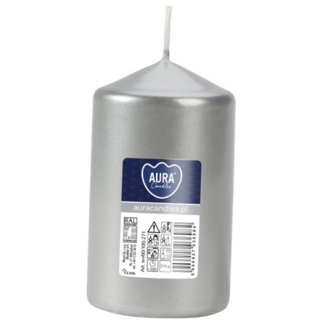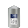 Świeca dekoracyjna w kolorze srebrny metalik, kształcie walca, bezzapachowa o wysokości 10cm, średnicy 5,8cm i czasie palenia do 30 godzin BISPOL.