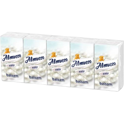 Delikatne chusteczki ALMUSSO Easy z balsamem, wyprodukowane z trzech miękkich i wytrzymałych warstw bibułki.