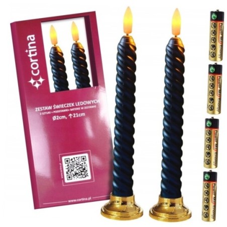 Świeca stołowa LED CORTINAw kolorze czarnym o wysokości 21cm, średnicy 2cm z imitacją efektu płomienia. Świeca najwyższej jakości, nie wydziela CO2.