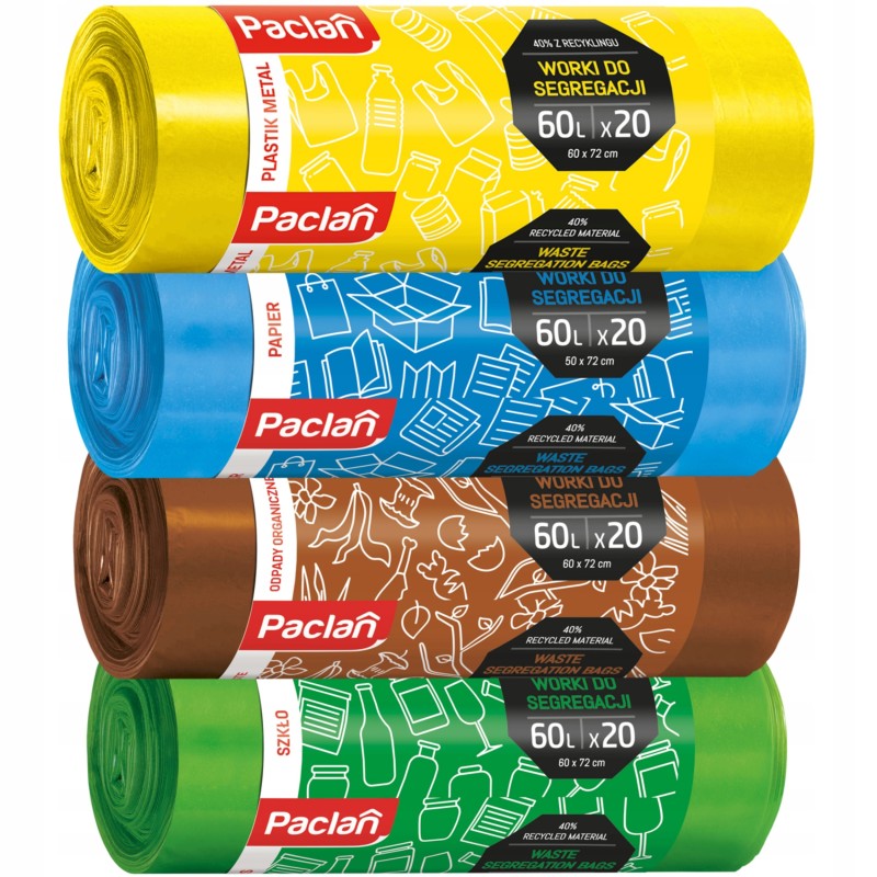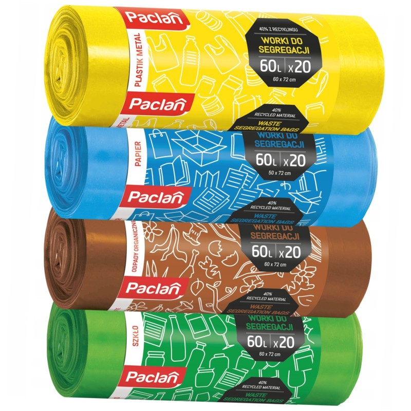 ZESTAW worków na śmieci o pojemności 60 litrów, przeznaczony do segregacji szkła, papieru, plastiku oraz odpadów bio. Worki wyróżniają się wyjątkową wytrzymałością i trwałością. Produkty Paclan pomagają nie tylko utrzymać porządek w otoczeniu, ale również przyczyniają się do ochrony naszej planety poprzez prawidłową segregację odpadów.
