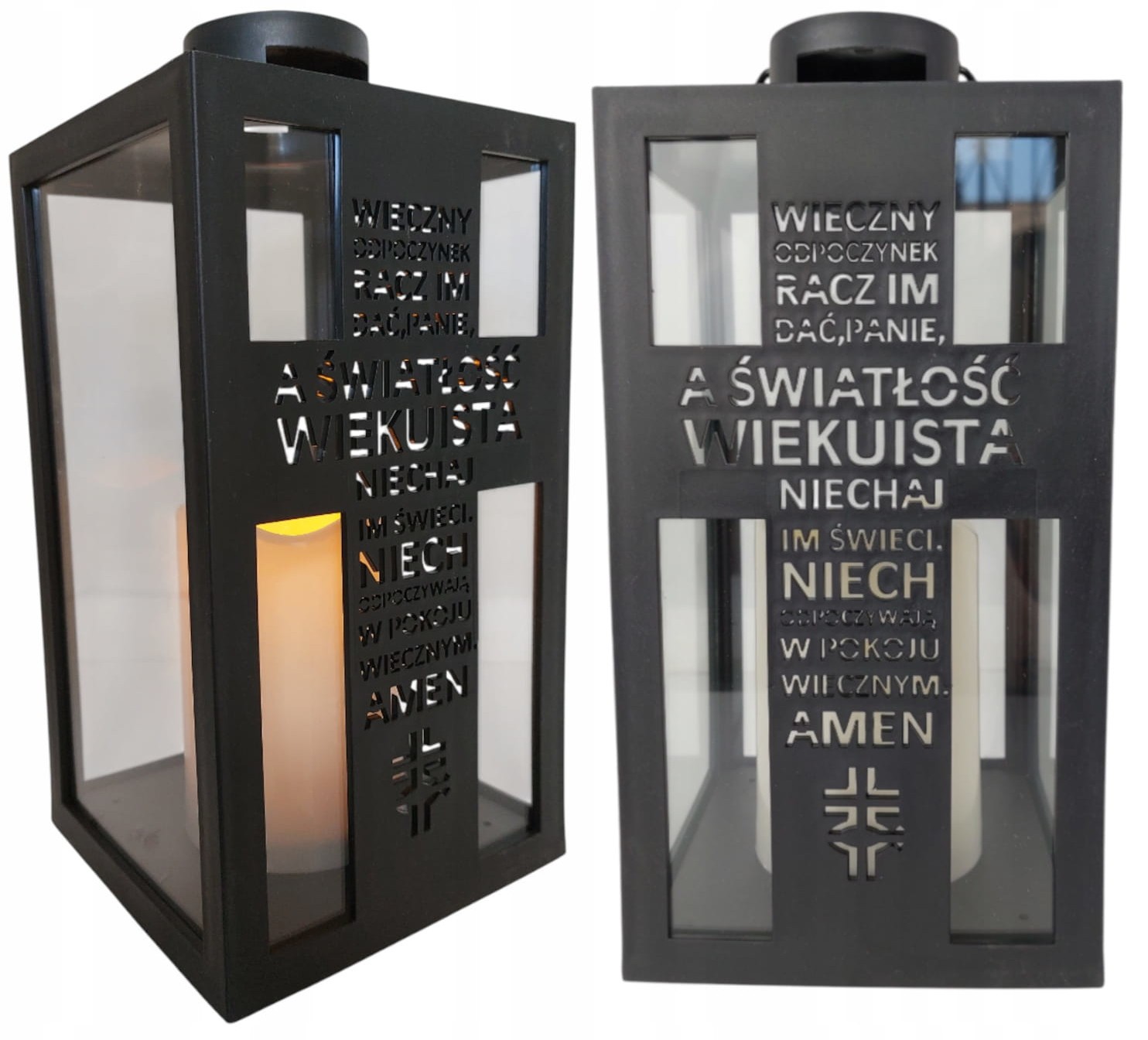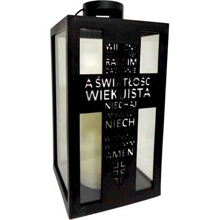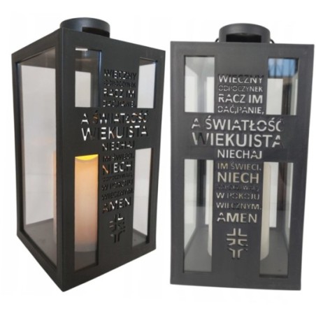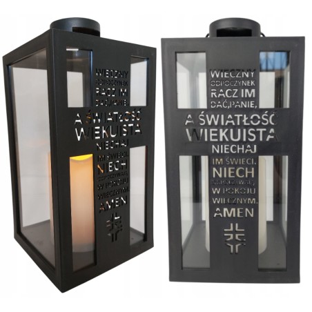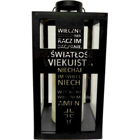 Latarenka dekoracyjna CORTINA z aplikacją "Wieczny Odpoczynek", w kolorze czarnym o wysokości 26cm, średnicy 18cm.