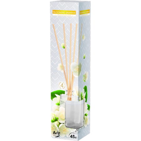 Dyfuzor zapachowy z patyczkami, kwitnący jaśmin o pojemności 45ml i trwałości zapachu do 4 tygodni BISPOL.