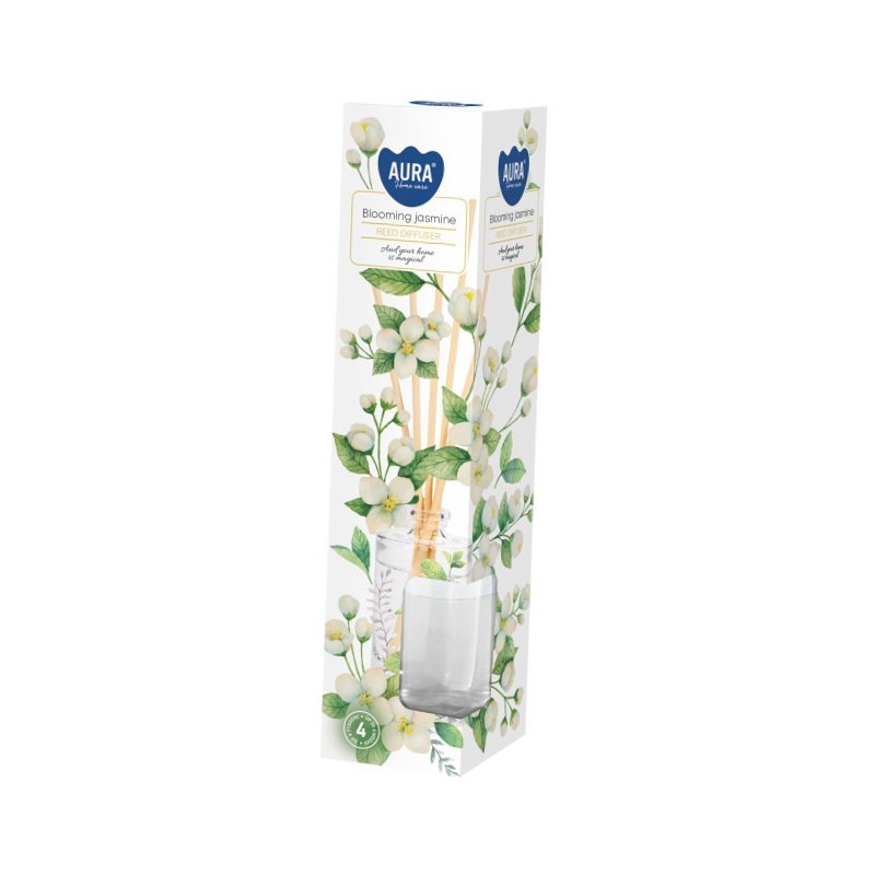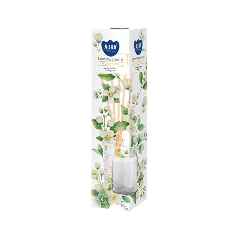 Dyfuzor zapachowy z patyczkami, kwitnący jaśmin o pojemności 45ml i trwałości zapachu do 4 tygodni BISPOL.