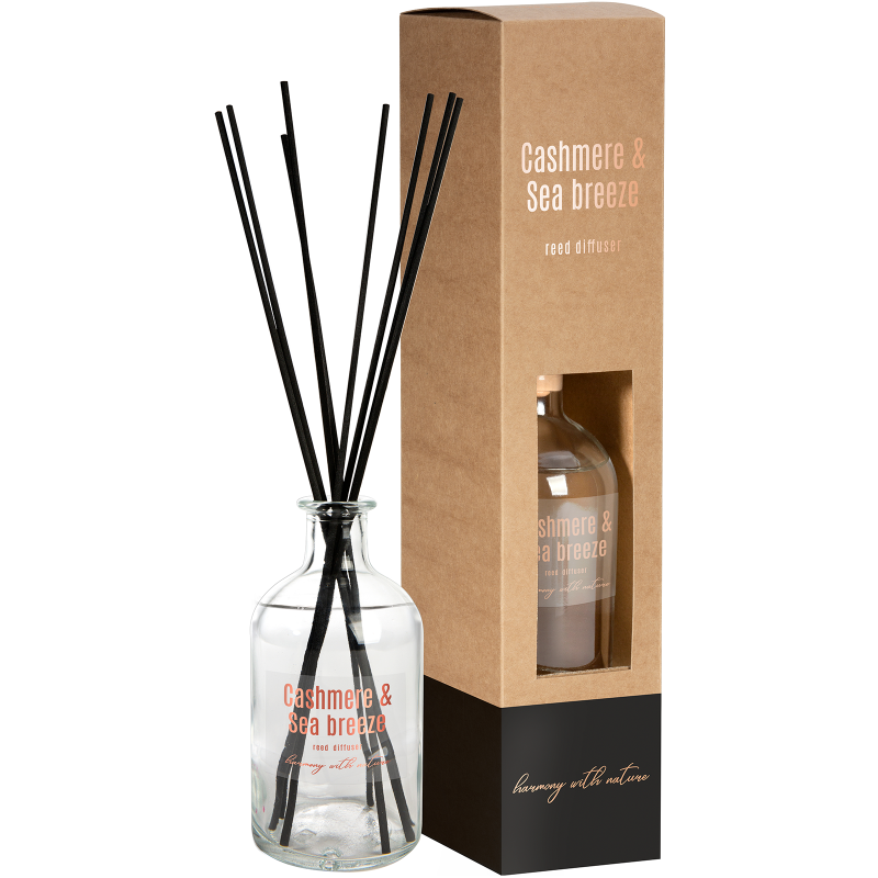 Dyfuzor zapachowy z patyczkami o zapachu kaszmiru i bryzy morskiej o pojemności 230ml i trwałości zapachu do 12 tygodni BISPOL.